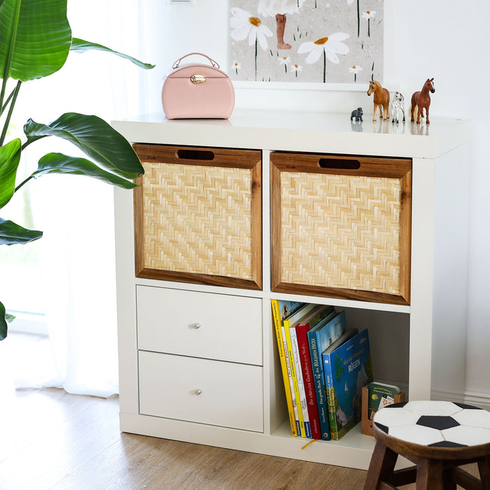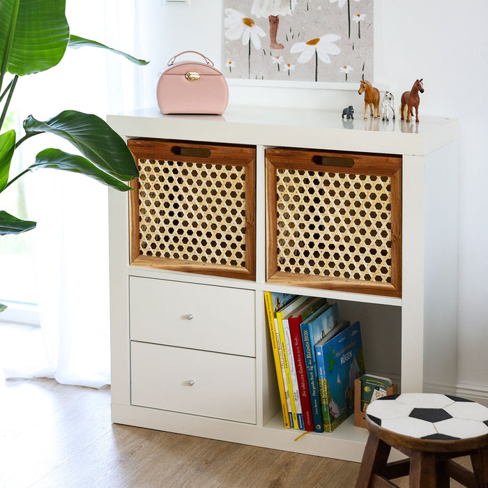 Mit den Außenmaßen von 32 x 34 x 32 cm und einem Gewicht von 1,23 kg ist sie ideal als Einsatz in Kallax- oder andere Würfelregalen geeignet.